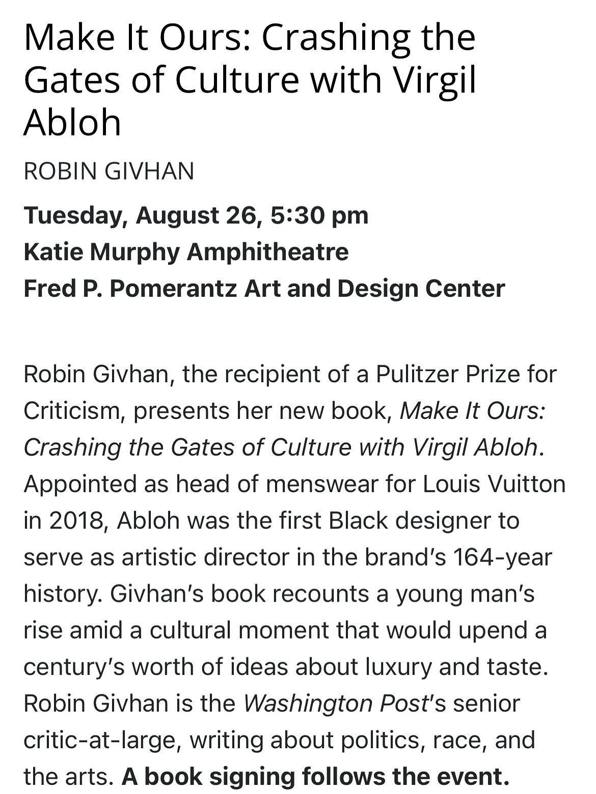 On November 6, I’ll be in conversation with Monica L. Miller at The 92nd Street Y in New York City. When I lived in New York, I went to so many events there. And now I’m beyond thrilled to take the stage to talk with Monica about Virgil, culture, diversity and optimism. Monica guest curated “Superfine” at the Met. She is an extraordinary thinker. And a lovely human. Please join us!